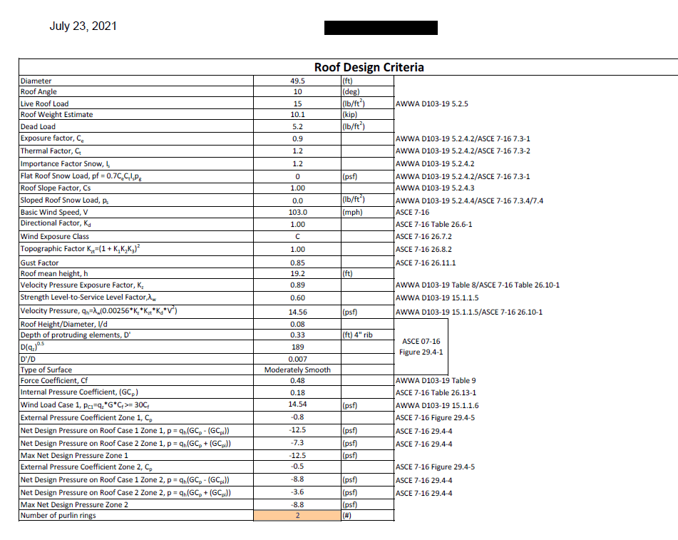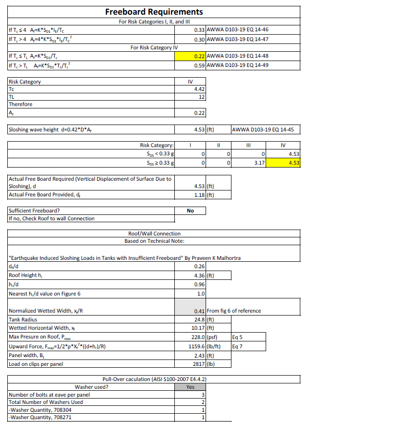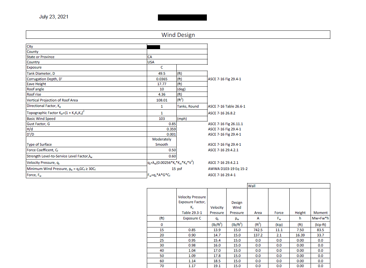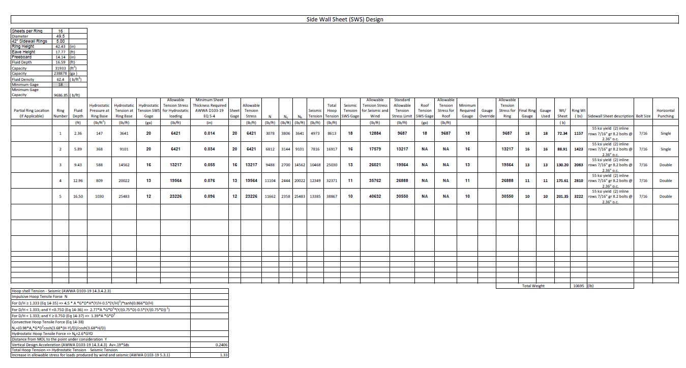 Wind loads and requirements are determined by chapter 15 of AWWA, and we also utilize ASCE 7-16, chapter 29, which reflects much of the AWWA standard. The sidewall sheet design is based on a combination of AISI for bolted joint connections as well as the requirements set forth by AWWA chapter 5.