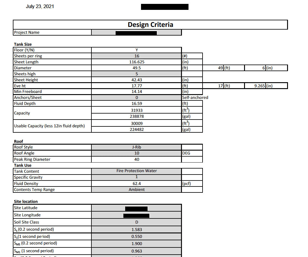 We do not adhere to the ‘flat sheet’ design aspect of the AWWA standard, but we do design the tank sidewall sheet thicknesses per the requirements of AWWA per sections 5.4 and 5.5, as well as seismic requirements as defined in 14.3.4.2.3. All seismic loads are calculated per the requirements of chapter 14, including freeboard requirements.