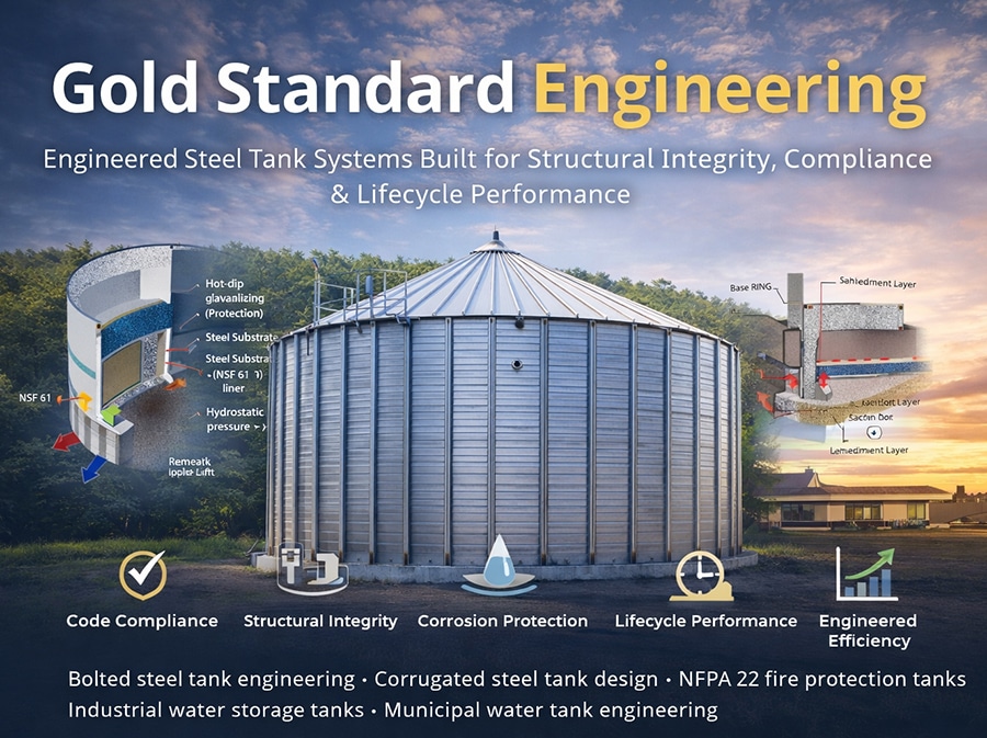 At SteelCore Tank, Gold Standard Engineering is a disciplined structural design methodology for bolted steel tanks, corrugated steel storage tanks, fire protection water tanks, municipal water storage tanks, and industrial liquid containment systems.