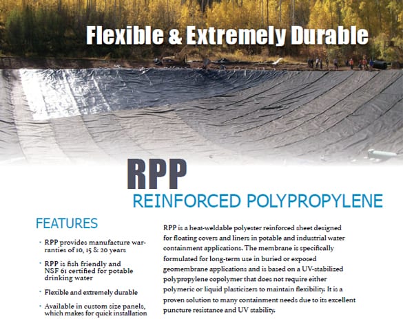 RPP is a heat-weldable polyester-reinforced sheet designed for floating covers and liners in potable and industrial water containment applications. The membrane is specifically formulated for long-term use in buried or exposed geomembrane applications and is based on a UV-stabilized polypropylene copolymer that does not require either polymeric or liquid plasticizers to maintain flexibility. It is a proven solution to many containment needs due to its excellent puncture resistance and UV stability.